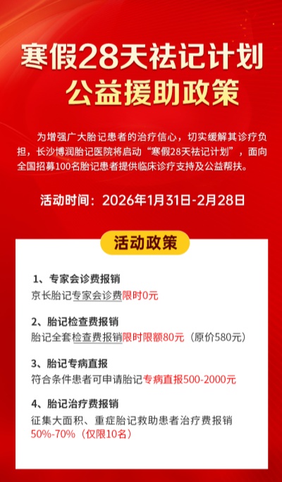 长沙博润一直以来都怀揣着“关爱患者、专业诊疗”的初心,深耕于胎记诊疗领域。医院汇聚了一批经验丰富、技术精湛的医疗人才,引进国际先进的诊疗设备和技术,致力于为患者提供优质、高效的医疗服务。凭借着专业的医疗水平和贴心的服务,长沙博润在业内赢得了良好的口碑,成为了众多胎记患者信赖的医院。此次推出的“寒假28天祛记计划”,正是医院积极履行社会责任的生动体现。医院充分利用寒假这一黄金时期,为全国100名胎记患者提供临床诊疗支持及公益帮扶。